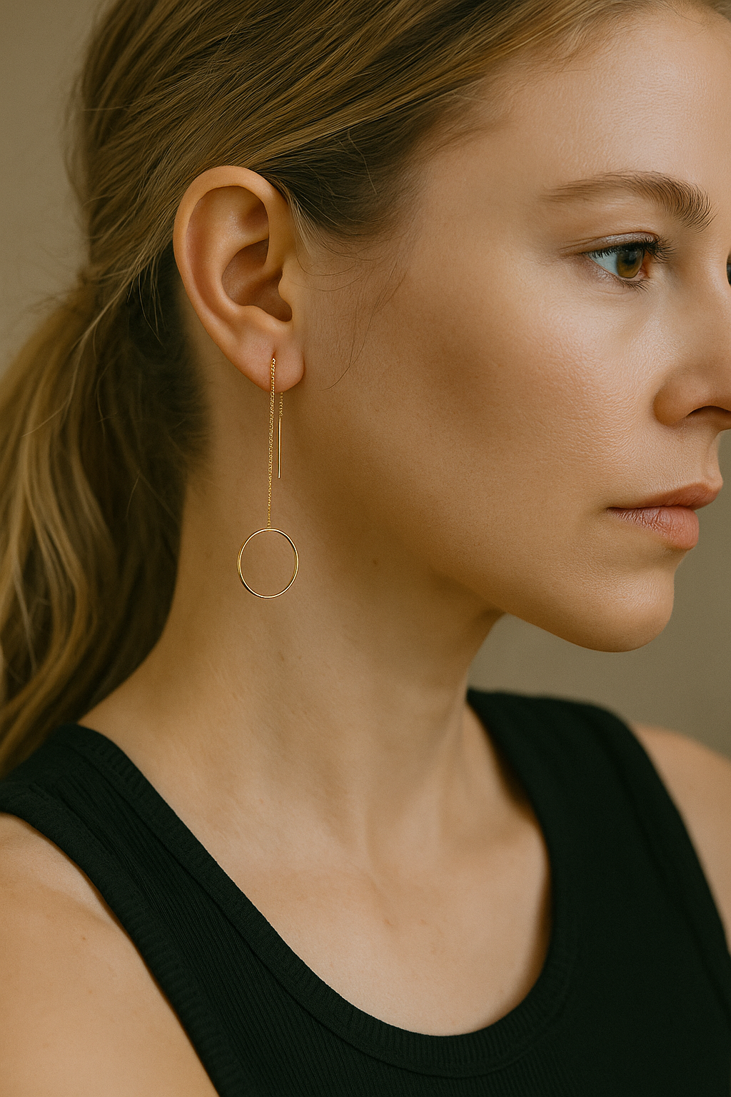 Gracefully simple, endlessly modern – the "Becca" Earrings feature a fine chain threader design finished with a sleek open circle. This floating silhouette moves gently with you, adding subtle elegance and contemporary flair to any look.