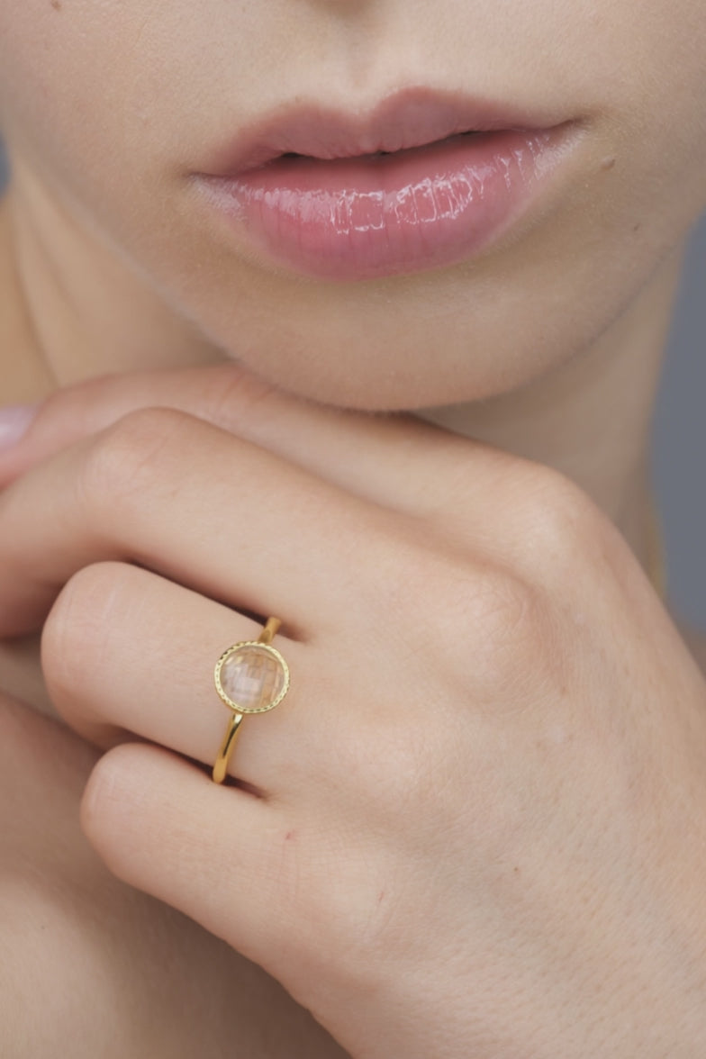Timeless elegance meets feminine finesse – our MONA Ring is a true expression of artisanal craftsmanship. The soft blush of the genuine rose quartz adds a sensual glow and highlights your natural beauty. Set in a delicate hammered bezel, the faceted semi-precious stone is framed in 925 sterling silver, refined with a luxurious 18k gold plating.
